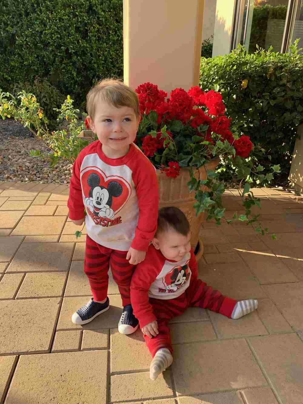 Here’s the last photo of the rugrats. They’re posing in my courtyard wearing their Mickey Mouse sweat shirts from Target and their pajama bottoms from Hanna Anderson. Could they be any cuter? Since these were from last year, take a look at my post, Valentine’s Day Outfits for Toddlers for some current Valentine’s day outfits for toddlers.
