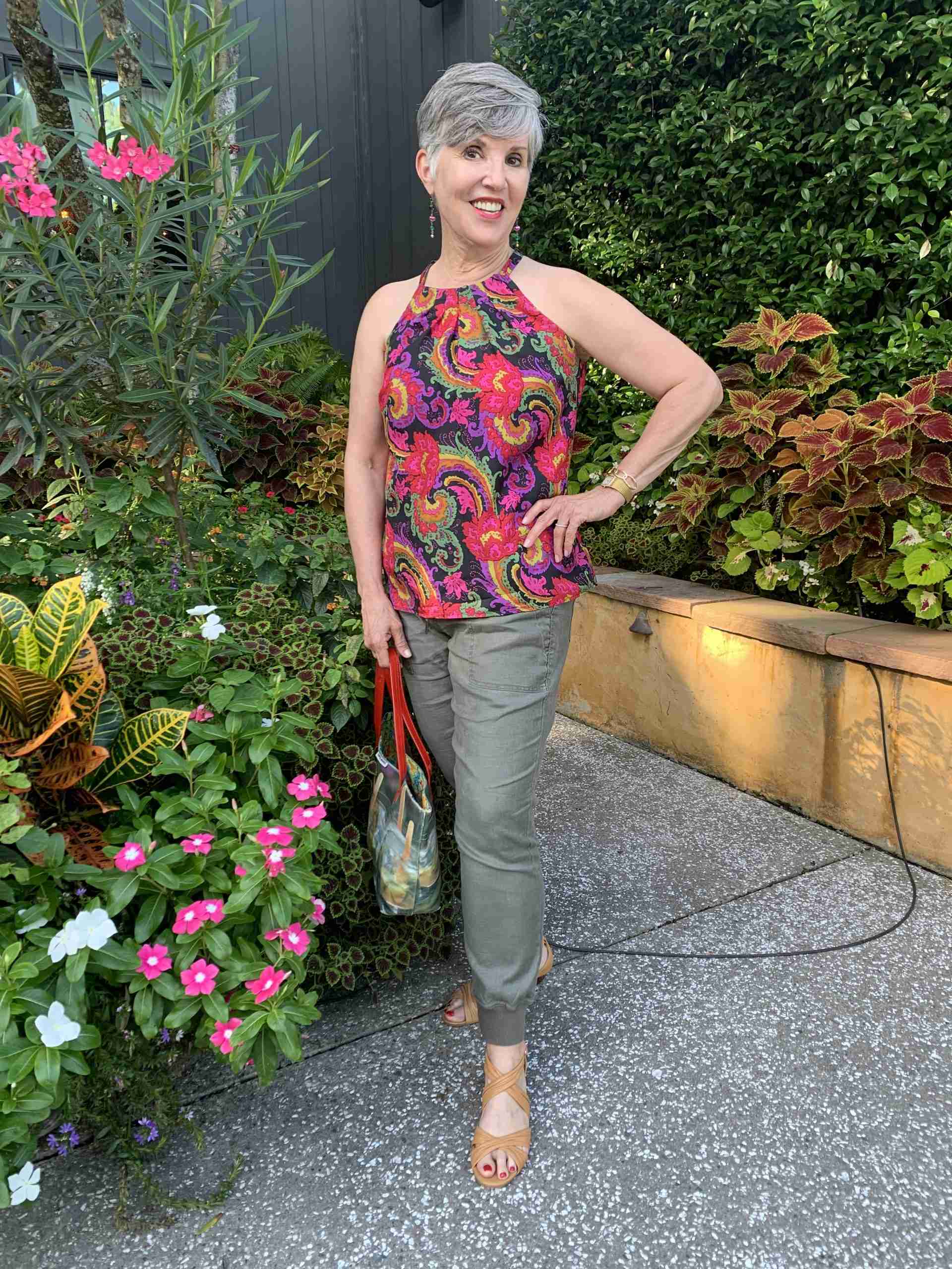 Another great transitional print is paisley. I love the jewel tones in many paisley prints as they feel so rich and classy at this time of year. I also think that olive blends nicely with these saturated colors. Unfortunately, my top is from last year but I have linked several below. If you don’t love sleeveless or halter tops, consider adding a coordinating cardigan as I did. (Here’s another post about paisley https://drjuliesfunlife.com/?s=paisley)