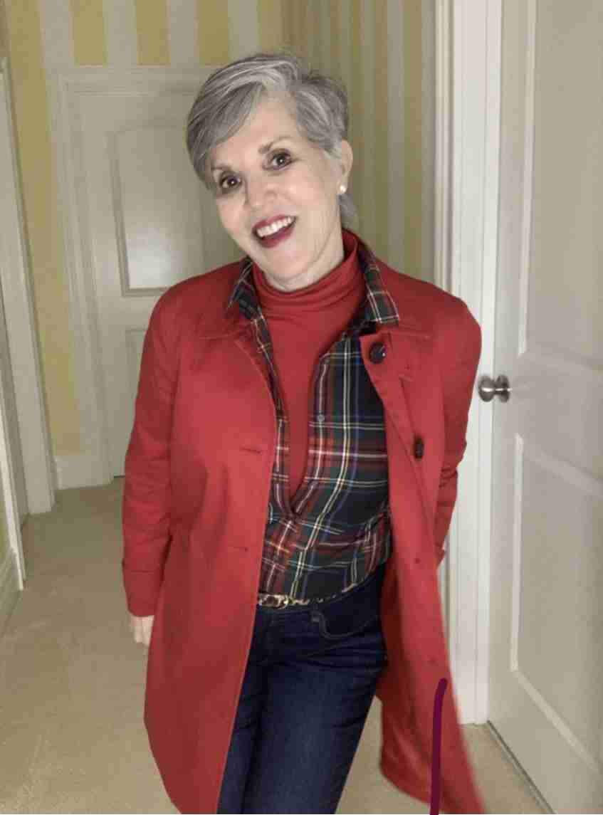 My shoes are a terrific find! My good friend Colleen was wearing these when I visited her this past summer in Kiawah. The shoes are Taos and I am wearing the charcoal color which goes well with khaki, black, and denim. Very versatile and comfy. They have wonderful sole inserts for support when walking or standing. Lastly, I added a Talbots red jacket that is kind of like a short trench coat (similar linked below).