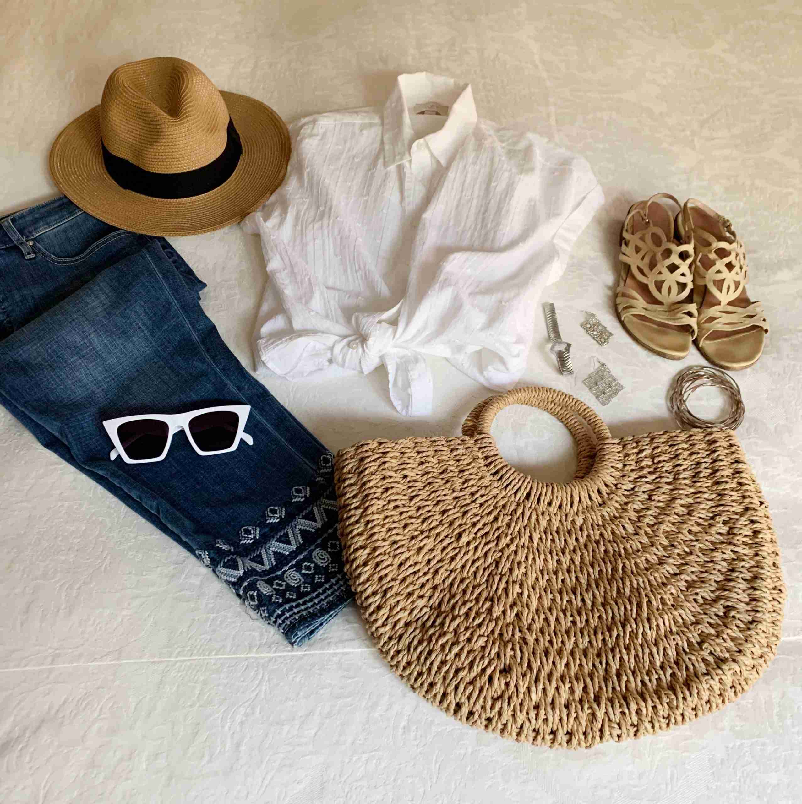 The first look above is sooo fun! I paired a pair of embroidered cropped jeans with a white slubby camp shirt (tied at the waist). My woven purse, nude suede block heeled sandals and Panama hat were all in similar natural tones. My sunglasses were white and my jewelry was all silver.
